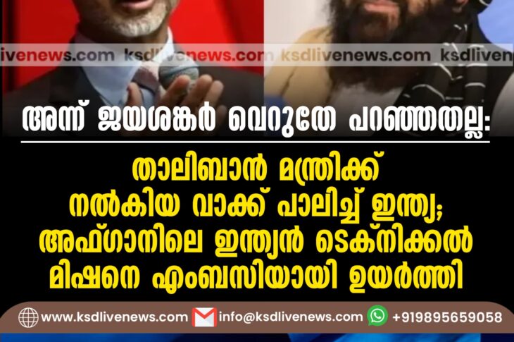 ദേശീയം അന്ന് ജയശങ്കര് വെറുതേ പറഞ്ഞതല്ല: താലിബാൻ മന്ത്രിക്ക് നല്കിയ വാക്ക് പാലിച്ച് ഇന്ത്യ; അഫ്ഗാനിലെ ഇന്ത്യൻ ടെക്നിക്കല് മിഷനെ എംബസിയായി ഉയര്ത്തിOctober 22, 2025