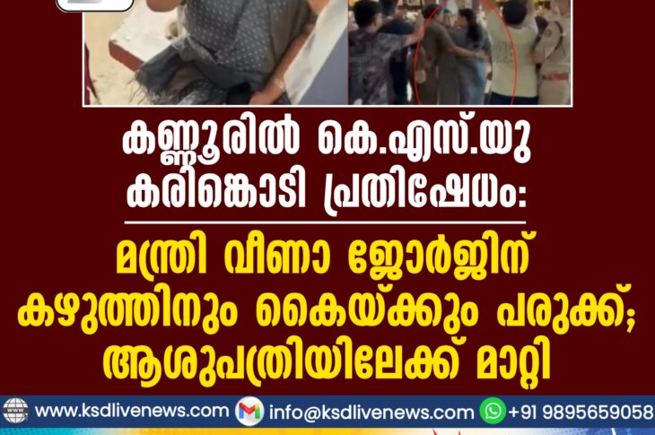 കണ്ണൂർ കണ്ണൂരിൽ കെ.എസ്.യു കരിങ്കൊടി പ്രതിഷേധം: മന്ത്രി വീണാ ജോർജിന് കഴുത്തിനും കൈയ്ക്കും പരുക്ക്; ആശുപത്രിയിലേക്ക് മാറ്റിFebruary 25, 2026