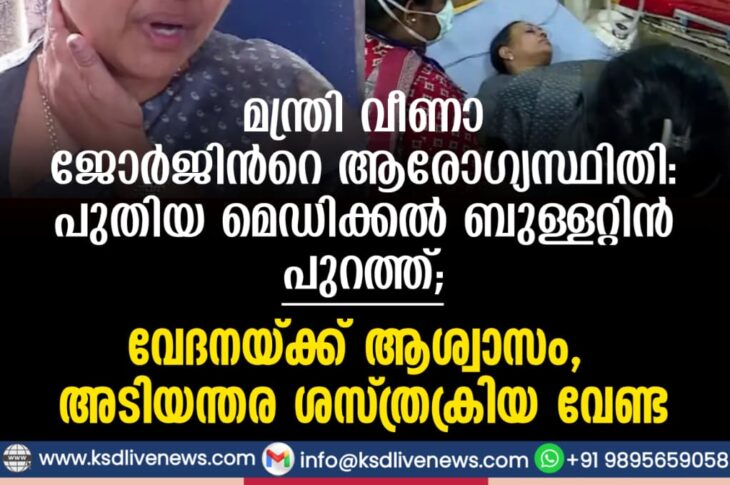 കണ്ണൂർ മന്ത്രി വീണാ ജോര്ജിന്റെ ആരോഗ്യസ്ഥിതി; പുതിയ മെഡിക്കല് ബുള്ളറ്റിൻ പുറത്ത്, ‘വേദനയ്ക്ക് ആശ്വാസം, അടിയന്തര ശസ്ത്രക്രിയ വേണ്ട’February 26, 2026