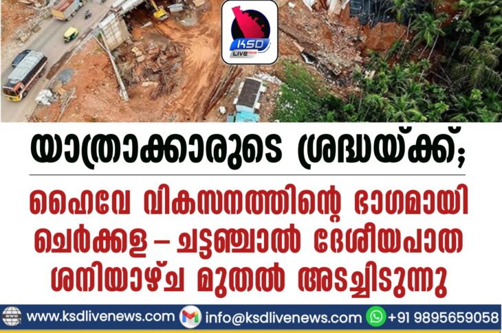 കാസർഗോഡ് യാത്രാക്കാരുടെ ശ്രദ്ധയ്ക്ക്; ഹൈവേ വികസനത്തിന്റെ ഭാഗമായി ചെർക്കള-ചട്ടഞ്ചാൽ ദേശീയപാത ശനിയാഴ്ച മുതൽ അടച്ചിടുന്നുApril 10, 2026