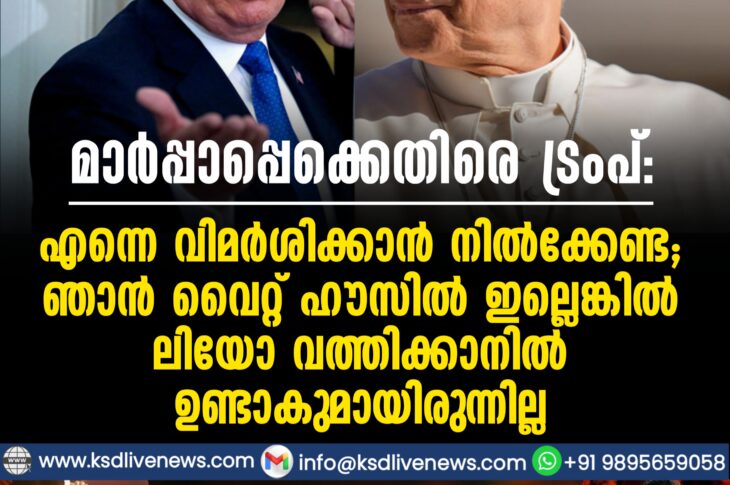 വിദേശം മാർപ്പാപ്പെക്കെതിരെ ട്രംപ്; ‘എന്നെ വിമർശിക്കാൻ നിൽക്കേണ്ട, ഞാൻ വൈറ്റ് ഹൗസിൽ ഇല്ലെങ്കിൽ ലിയോ വത്തിക്കാനിൽ ഉണ്ടാകുമായിരുന്നില്ലApril 13, 2026