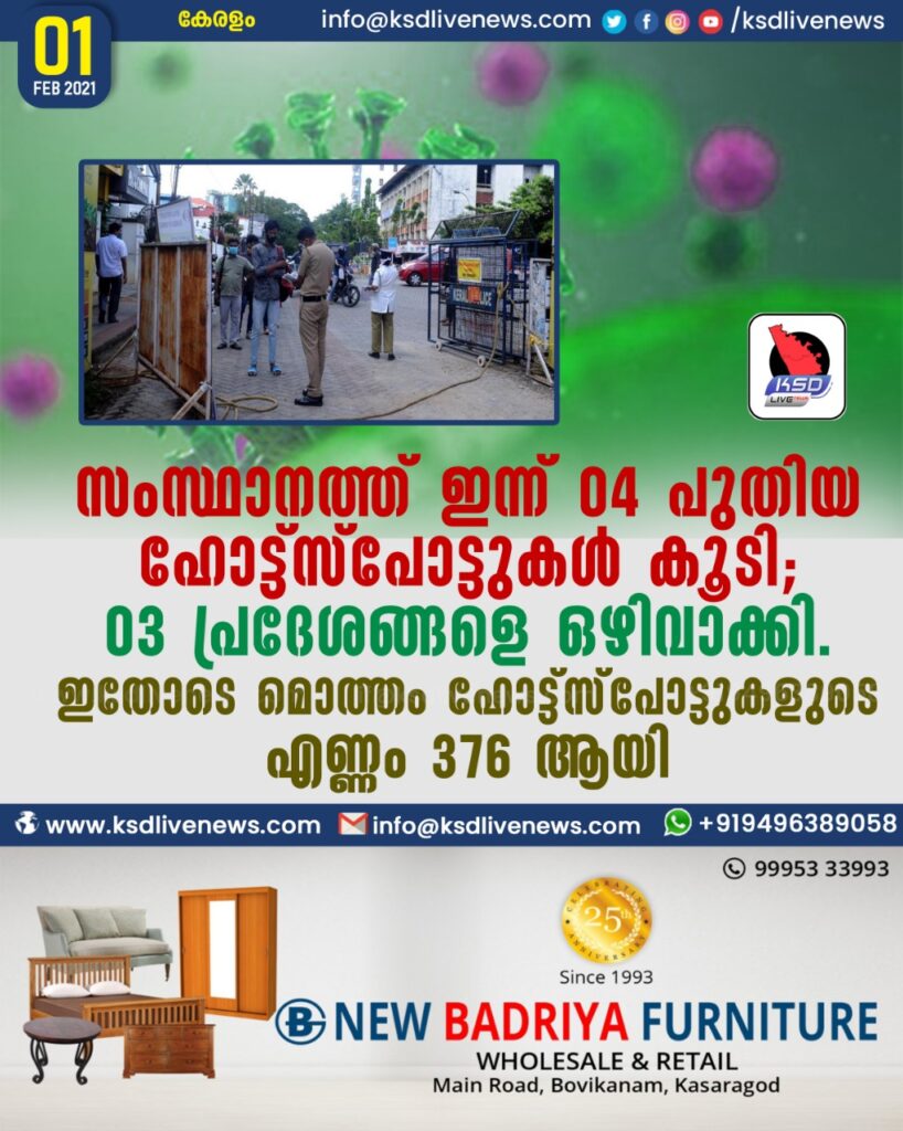 സംസ്ഥാനത്ത് ഇന്ന് 04 പുതിയ ഹോട്ട്സ്പോട്ടുകള് കൂടി; 03 പ്രദേശങ്ങളെ ഒഴിവാക്കി. ഇതോടെ മൊത്തം ഹോട്ട്സ്പോട്ടുകളുടെ എണ്ണം 376 ആയി.