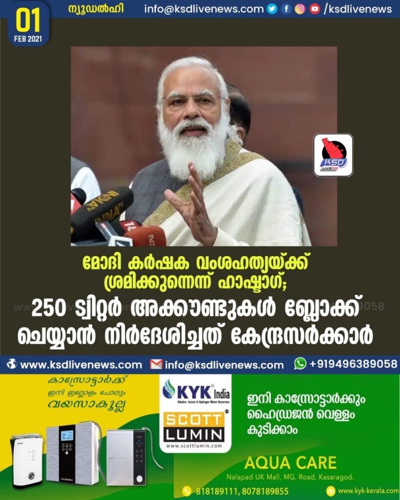 മോദി കർഷക വംശഹത്യയ്ക്ക് ശ്രമിക്കുന്നെന്ന് ഹാഷ്ടാഗ് ; 250 ട്വിറ്റർ അക്കൗണ്ടുകൾ ബ്ലോക്ക് ചെയ്യാൻ നിർദേശിച്ചത് കേന്ദ്രസർക്കാർ