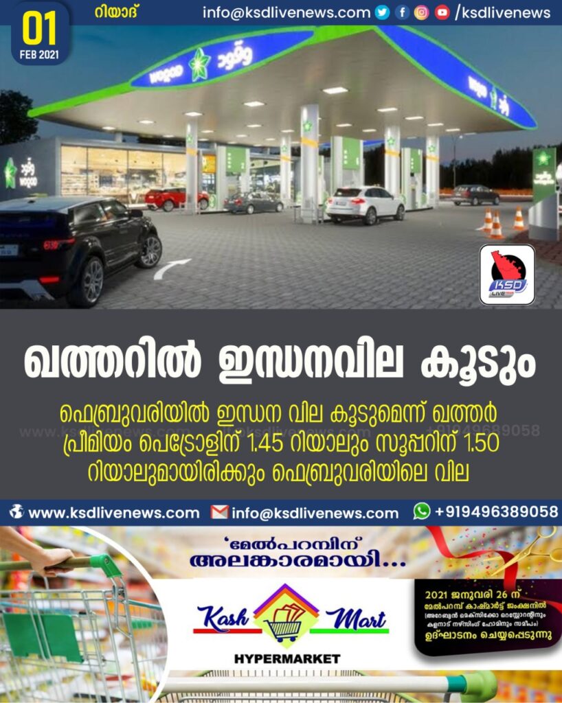 ദോഹ: ഫെബ്രുവരിയില് ഇന്ധന വില കൂടുമെന്ന് ഖത്തര് . പ്രീമിയം പെട്രോളിന് 1.45 റിയാലും സൂപ്പറിന് 1.50 റിയാലുമായിരിക്കും ഫെബ്രുവരിയിലെ വില. ജനുവരിയിലെ നിരക്കിനേക്കാള് 15 ദിര്ഹമിന്റെ വര്ധനവാണ് രേഖപ്പെടുത്തിയിരിക്കുന്നത് .അതെ സമയം ഡീസലിനും ഫെബ്രുവരിയില് വില കൂടിയിട്ടുണ്ട്. 1.45 റിയാലാണ് പുതിയ വില. ജനുവരിയേക്കാള് 15 ദിര്ഹമിന്റെ വര്ധന.