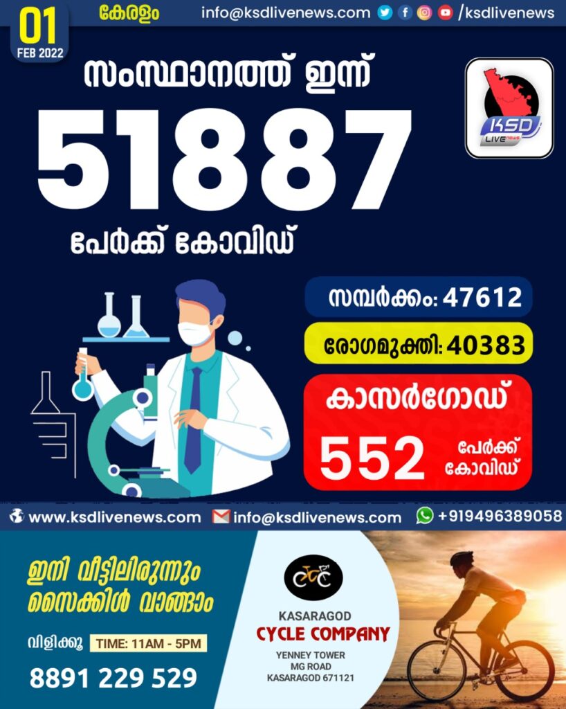 സംസ്ഥാനത്ത് ഇന്ന് 51887 കോവിഡ് സ്ഥിരീകരിച്ചു. സമ്പർക്കം വഴി 47612 പേർക്കും ; ആശ്വാസമായി 40383 പേർക്ക് രോഗമുക്തി ; കാസർഗോഡ് ജില്ലയിൽ 552 പേർക്ക് പുതിയ കോവിഡ് കേസുകൾ ; മരണം 24