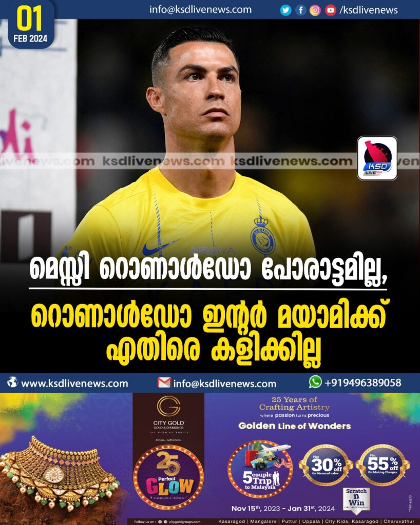 മെസ്സി റൊണാൾഡോ പോരാട്ടമില്ല, റൊണാൾഡോ ഇന്റർ മയാമിക്ക് എതിരെ കളിക്കില്ല