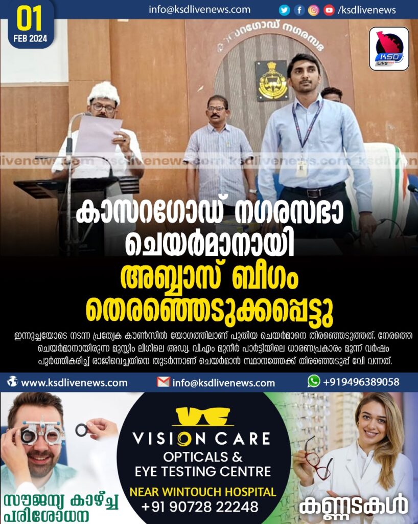 കാസറഗോഡ് നഗരസഭാ ചെയർമാനായി അബ്ബാസ് ബീഗം തെരഞ്ഞെടുക്കപ്പെട്ടു