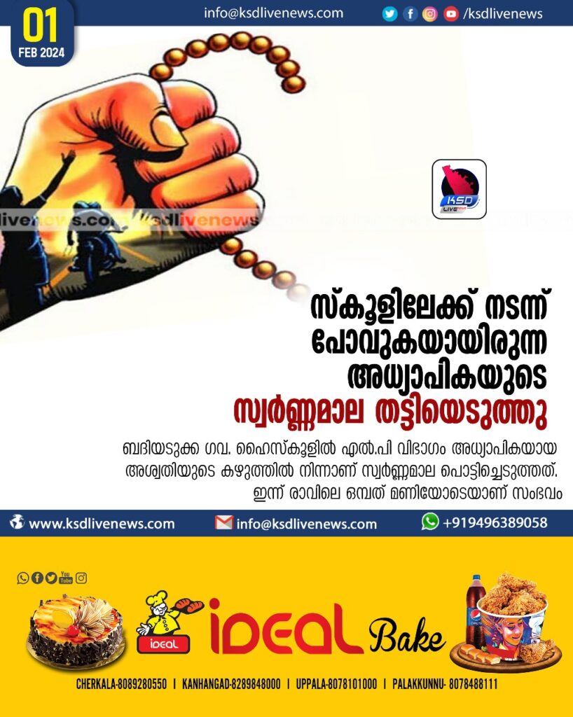 അശ്വതി മാല വലിച്ചുപിടിച്ചതോടെ പകുതി കഷണം മാത്രമേ മോഷ്ടാവിന് ലഭിച്ചുള്ളൂ. ഈ കഷണവുമായി മോഷ്ടാവ് ബൈക്കില് സ്ഥലം വിടുകയായിരുന്നു. അധ്യാപികയുടെ പരാതിയില് ബദിയടുക്ക പൊലീസ് കേസെടുത്ത് അന്വേഷണം തുടങ്ങി. കഴിഞ്ഞ മാസം ബോളുക്കട്ട അര്ത്തിപ്പള്ളയിലും മാല പിടിച്ചുപറിച്ച സംഭവമുണ്ടായിരുന്നു. ഈ സംഭവത്തിലും പൊലീസ് കേസെടുത്തെങ്കിലും പ്രതിയെ കണ്ടെത്താനായില്ല. ബദിയടുക്ക പഞ്ചായത്തിന്റെ പണി തീരാത്ത ടൗണ് ഹാള് ഈ ഭാഗത്തുണ്ട്.