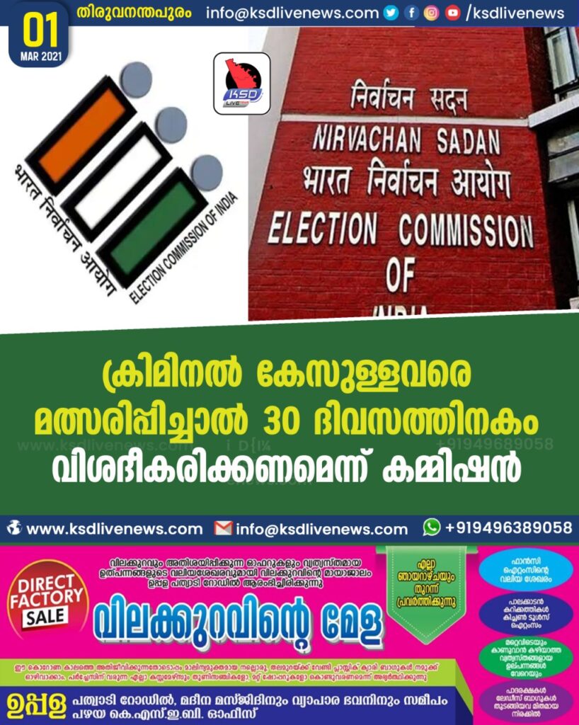 ക്രിമിനൽ കേസുള്ളവരെ മത്സരിപ്പിച്ചാൽ 30 ദിവസത്തിനകം വിശദീകരിക്കണമെന്ന് കമ്മിഷൻ