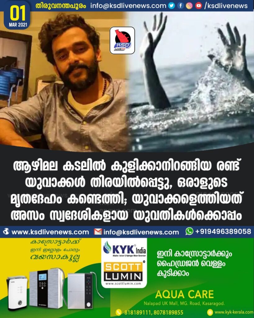 ആഴിമല കടലിൽ കുളിക്കാനിറങ്ങിയ രണ്ട് യുവാക്കൾ തിരയിൽപ്പെട്ടു , ഒരാളുടെ മൃതദേഹം കണ്ടെത്തി ; യുവാക്കളെത്തിയത് അസം സ്വദേശികളായ യുവതികൾക്കൊപ്പം