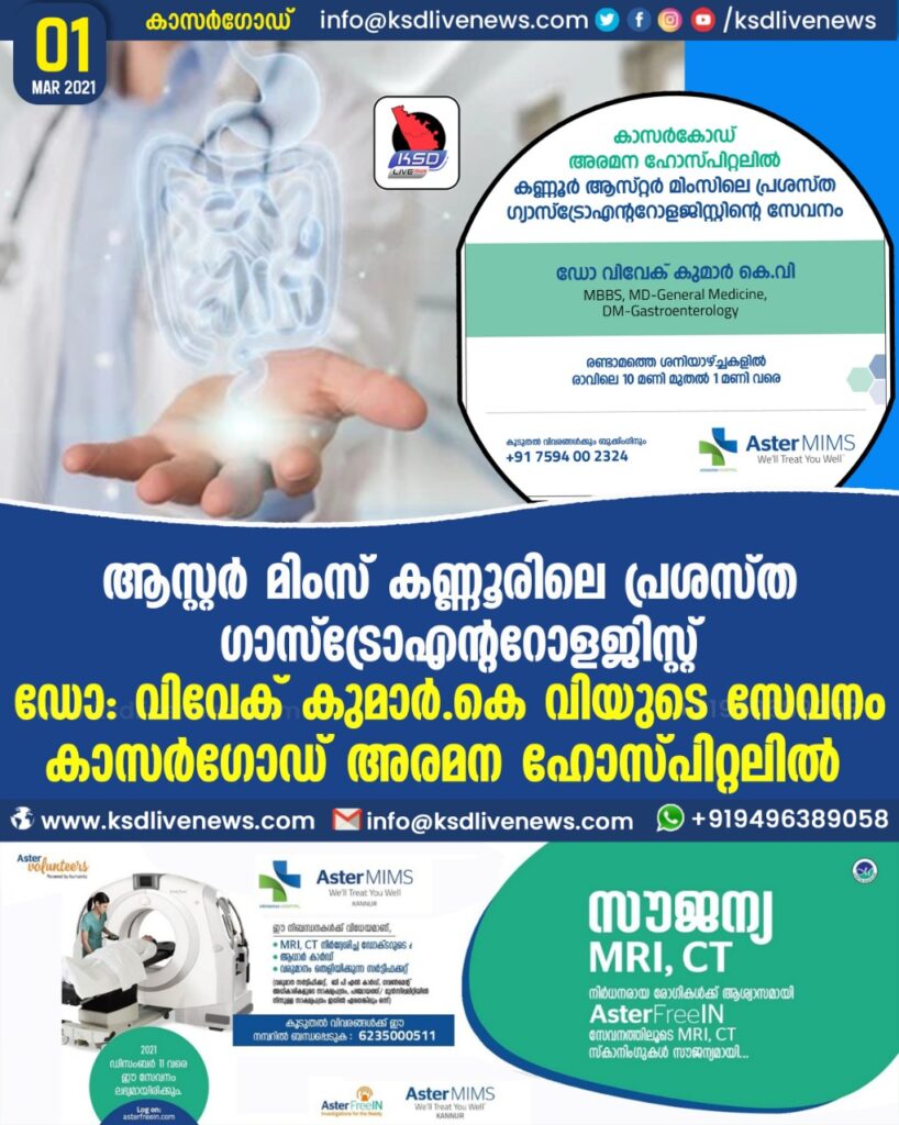 കാസർകോഡ് അരമന ഹോസ്പിറ്റലിൽ ആസ്റ്റർ മിംസ് ഹോസ്പിറ്റൽ കണ്ണൂരിലെ പ്രശസ്ത ഗാസ്ട്രോഎന്ററോളജിസ്റ്റ് ഡോകടർ വിവേക് കുമാർ കെ വി യുടെ സേവനം 13/03/2021 ശനിയാഴ്ച്ച രാവിലെ 10 മണി മുതൽ 1 മണി വരെ ഉണ്ടായിരിക്കുന്നതാണ്. ബുക്കിങ്ങിന് വിളിക്കേണ്ട നമ്പർ: