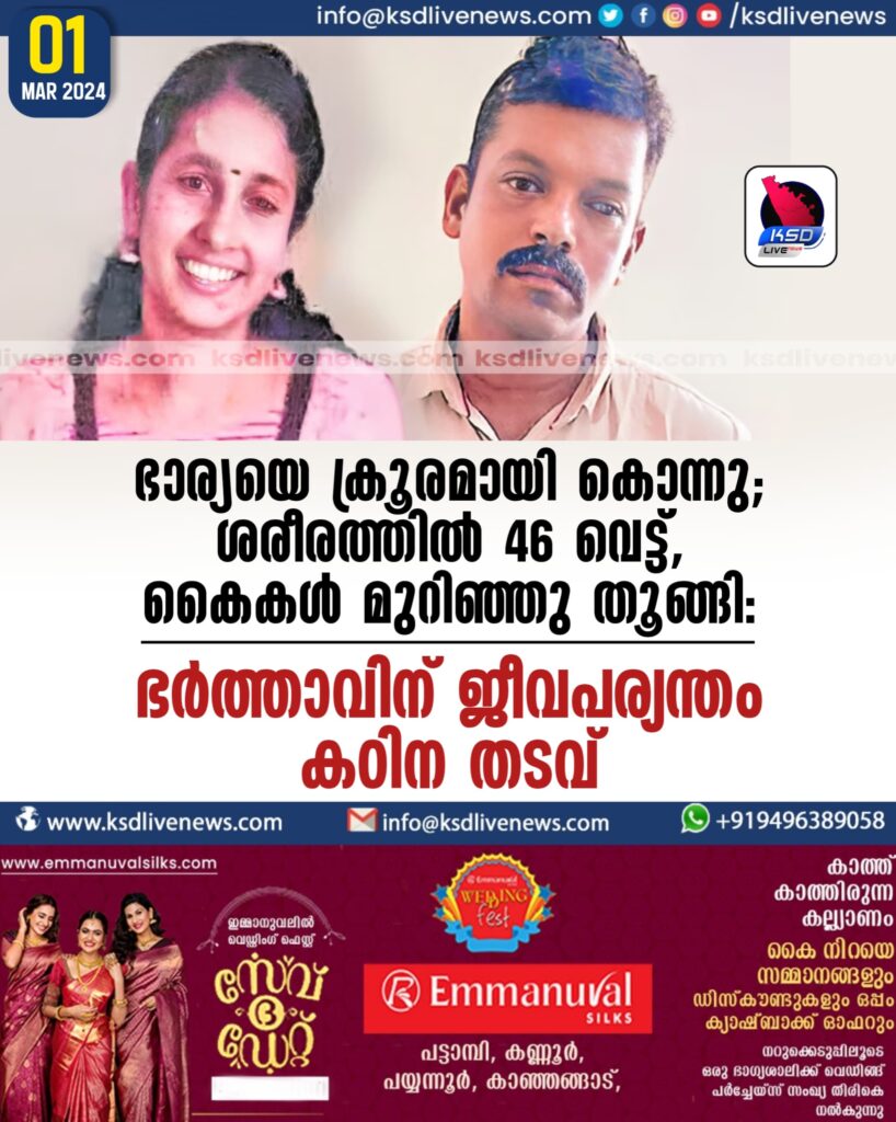 ഭാര്യയെ ക്രൂരമായി കൊന്നു; ശരീരത്തിൽ 46 വെട്ട്, കൈകൾ മുറിഞ്ഞു തൂങ്ങി: ഭർത്താവിന് ജീവപര്യന്തം കഠിന തടവ്