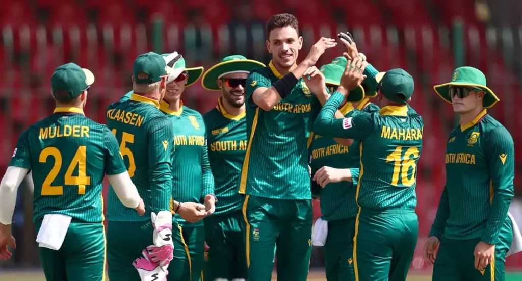 ബാറ്റിങിനിറങ്ങിയ ഇംഗ്ലണ്ടിന്റെ തുടക്കം മികച്ചതായില്ല. ആദ്യ ഓവറിലെ അവസാന പന്തിൽ ഫിൽ സാൾട്ടിനെ(8) മടക്കി മാർക്കോ ജാൻസൻ വിക്കറ്റ് വേട്ടക്ക് തുടക്കമിട്ടു. തൊട്ടു പിന്നാലെ ജാമി സ്മിത്തിനെ(0) ജാൻസൻ എയ്ഡൻ മാർക്രത്തിന്റെ കൈകളിലെത്തിച്ചു. മികച്ച ഫോമിലുള്ള ബെൻ ഡക്കറ്റിനേയും(24) മടക്കി. ഇതോടെ ഒരുവേള 37-3 എന്ന നിലയിലായി ത്രീലയൺസ്. എന്നാൽ നാലാം വിക്കറ്റിൽ ഒത്തുചേർന്ന ജോ റൂട്ട്-ഹാരി ബ്രൂക്ക് കൂട്ടുകെട്ട് പ്രതീക്ഷ നൽകി. ബ്രൂക്കിനെ(19) മാർക്കോ ജാൻസന്റെ കൈകളിലെത്തിച്ച് കേശവ് മഹാരാജ് നിർണായക ബ്രേക്ക് ത്രൂ നൽകി. തുടർന്നെത്തിയ ലിവിങ്സ്റ്റൺ(9),ജാമി ഓവർട്ടൻ(11) എന്നിവർക്കൊന്നും പിടിച്ചുനിൽക്കാനായില്ല. ഒൻപതാമനായി നായകൻ ജോസ് ബട്ലർ(21)കൂടി മടങ്ങിയതോടെ ഇംഗ്ലണ്ട് പോരാട്ടം 200 കടക്കാതെ അവസാനിച്ചു. ആദ്യ രണ്ട് മത്സരങ്ങൾ തോറ്റ ഇംഗ്ലണ്ട് നേരത്തെ ടൂർണമെന്റിൽ നിന്ന് പുറത്തായിരുന്നു.