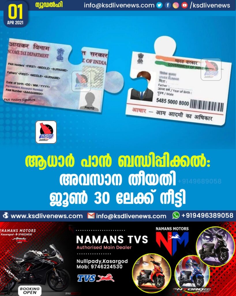 ആധാര്‍ – പാന്‍ ബന്ധിപ്പിക്കല്‍: അവസാന തീയതി ജൂണ്‍ 30 ലേക്ക് നീട്ടി