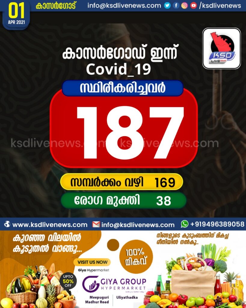 കാസർഗോഡ് ജില്ലയിൽ ഇന്ന് 187 പേർക്ക് കോവിഡ് സ്ഥിരീകരിച്ചു. സമ്പർക്കം വഴി 169 പേർക്കും. 38 പേർക്ക് രോഗമുക്തിSHARE THIS ONകാസർഗോഡ് ജില്ലയിൽ ഇന്ന് 187 പേർക്ക് കോവിഡ് സ്ഥിരീകരിച്ചു. സമ്പർക്കം വഴി 169 പേർക്കും. 38 പേർക്ക് രോഗമുക്തി
