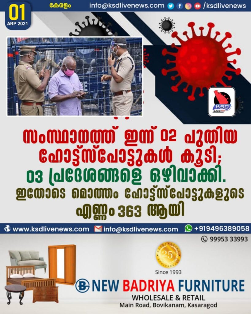 സംസ്ഥാനത്ത് ഇന്ന് 02 പുതിയ ഹോട്ട്സ്പോട്ടുകള് കൂടി; 03 പ്രദേശങ്ങളെ ഒഴിവാക്കി. ഇതോടെ മൊത്തം ഹോട്ട്സ്പോട്ടുകളുടെ എണ്ണം 363 ആയി.SHARE THIS ONസംസ്ഥാനത്ത് ഇന്ന് 02 പുതിയ ഹോട്ട്സ്പോട്ടുകള് കൂടി; 03 പ്രദേശങ്ങളെ ഒഴിവാക്കി. ഇതോടെ മൊത്തം ഹോട്ട്സ്പോട്ടുകളുടെ എണ്ണം 363 ആയി.