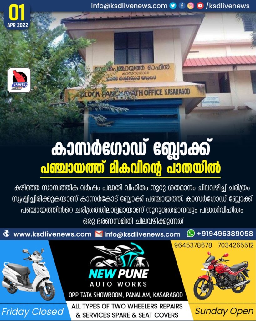 കാസർഗോഡ്: കഴിഞ്ഞ സാമ്പത്തിക വർഷം പദ്ധതി വിഹിതം നൂറു ശതമാനം ചിലവഴിച്ച് ചരിത്രം സൃഷ്ടിച്ചിരിക്കുകയാണ് കാസർകോട് ബ്ലോക്ക് പഞ്ചായത്ത്. കാസർഗോഡ് ബ്ലോക്ക് പഞ്ചായത്തിൻറെ ചരിത്രത്തിലാദ്യമായാണ് നൂറുശതമാനവും പദ്ധതിവിഹിതം ഒരു ഭരണസമിതി ചിലവഴിക്കുന്നത്.