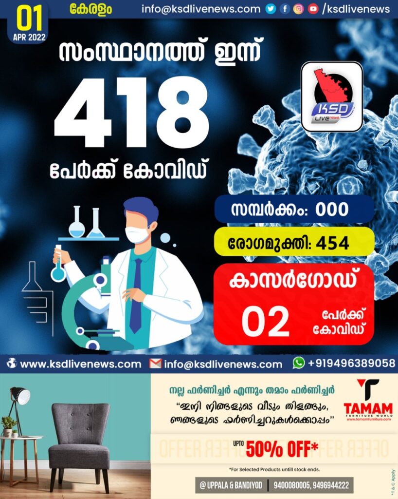 സംസ്ഥാനത്ത് ഇന്ന് 418 കോവിഡ് സ്ഥിരീകരിച്ചു. സമ്പർക്കം വഴി 00 പേർക്കും ; ആശ്വാസമായി 454 പേർക്ക് രോഗമുക്തി ; കാസർഗോഡ് ജില്ലയിൽ 02 പേർക്ക് പുതിയ കോവിഡ് കേസുകൾ ; മരണം 00