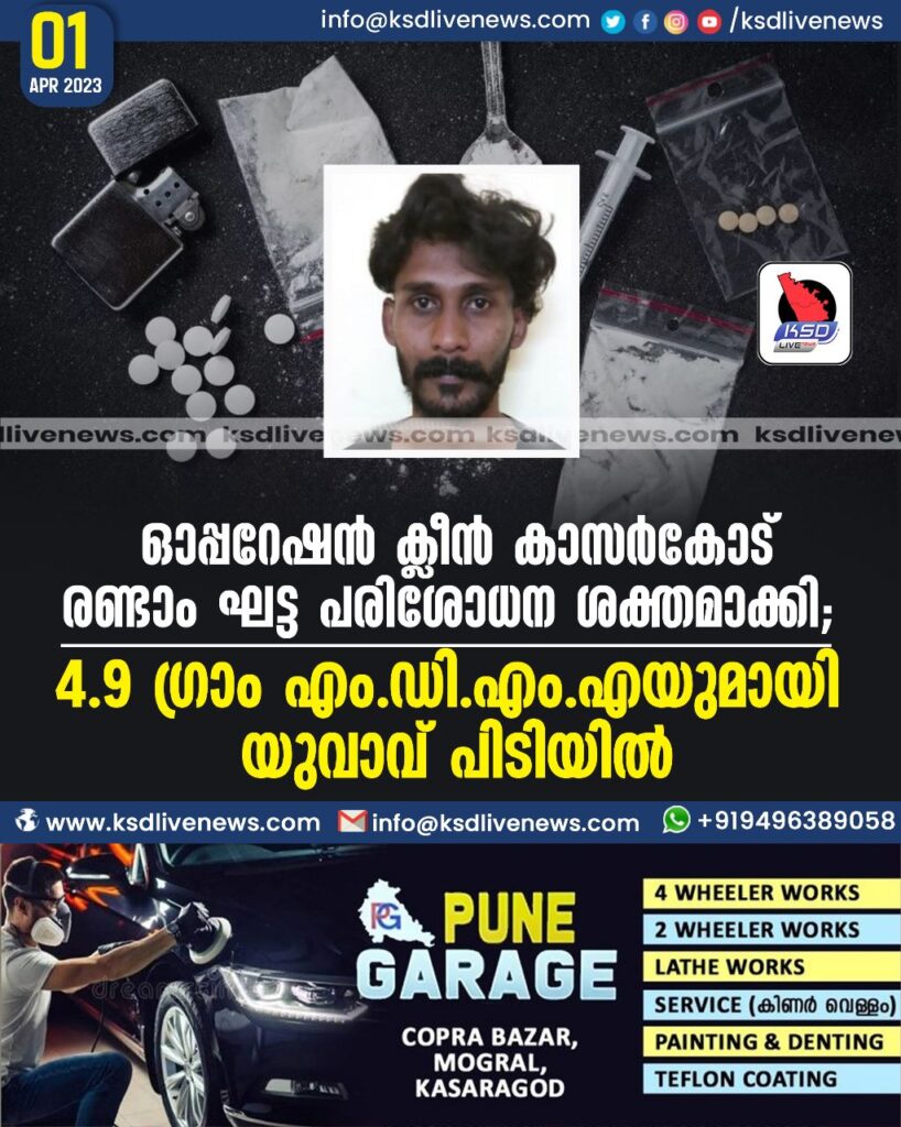 ഓപ്പറേഷന് ക്ലീന് കാസര്കോട് രണ്ടാം ഘട്ട പരിശോധന ശക്തമാക്കി;4.9 ഗ്രാം എം.ഡി.എം.എയുമായി യുവാവ് പിടിയില്