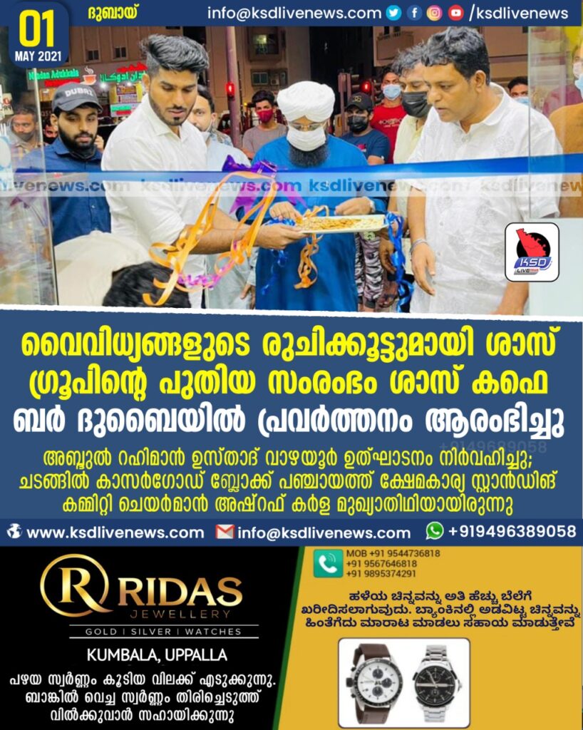 വികസന മേഖലകളിലെ കുതിപ്പിനൊപ്പം അനുദിനം വളർന്നു കൊണ്ടിരിക്കുന്ന ബർ ദുബായ് മിനാബസാറിൽ വൈവിധ്യങ്ങളുടെ രുചിക്കൂട്ടുകളുമായി ശാസ് ഗ്രുപ്പിന്റെ പുതിയ സംരഭം മായ ശാസ് കഫെ തുറന്ന് പ്രവർത്തനം ആരംഭിച്ചു അബ്ദുൽ റഹിമാൻ ഉസ്താദ് വാഴയൂർ ഉത്കഠണം നിർവഹിച്ചു ചടങ്ങിൽ കാസർഗോഡ് ബ്ലോക്ക് പഞ്ചായത്ത് ക്ഷേമകാര്യസ്റ്റാൻഡിങ് കമ്മിറ്റി ചെയർമാൻ അഷ്‌റഫ് കർള മുഖ്യാതിഥിയായിരുന്നു ശാസ് ഗ്രൂപ്പ് ചെയർ മാൻ സാബിത് സാമൂഹിക, സാംസ്കാരിക, വാണിജ്യ രംഗങ്ങളിലെ പ്രമുഖരായ നാസർ മുട്ടം നൗഷാദ് കനിയപാടി ശാഹുൽ തങ്ങൾ . അഴർ . സബാദ്.അബ്ദുല്ല അറഫാത്ത് എന്നിവർ സംമ്പ ദ്ദിച്ചു