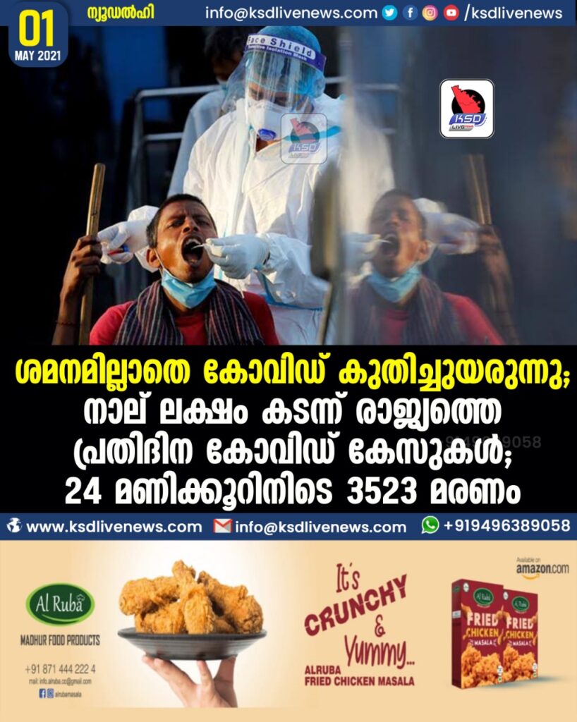 ശമനമില്ലാതെ കോവിഡ് കുതിച്ചുയരുന്നു ; നാല് ലക്ഷം കടന്ന് രാജ്യത്തെ പ്രതിദിന കോവിഡ് കേസുകള്‍; 24 മണിക്കൂറിനിടെ 3523 മരണം