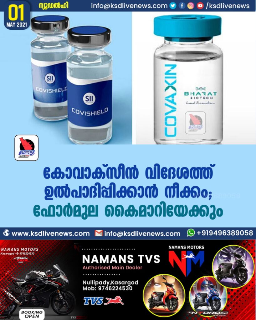 കോവാക്സീന്‍ വിദേശത്ത് ഉല്‍പാദിപ്പിക്കാൻ നീക്കം; ഫോര്‍മുല കൈമാറിയേക്കും