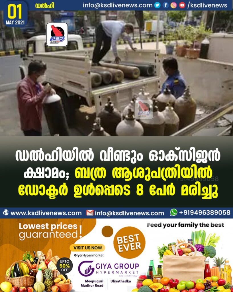 ഡല്ഹിയിൽ വീണ്ടും ഓക്സിജന് ക്ഷാമം; ബത്ര ആശുപത്രിയില് ഡോക്ടര് ഉള്പ്പെടെ 8 പേര് മരിച്ചു