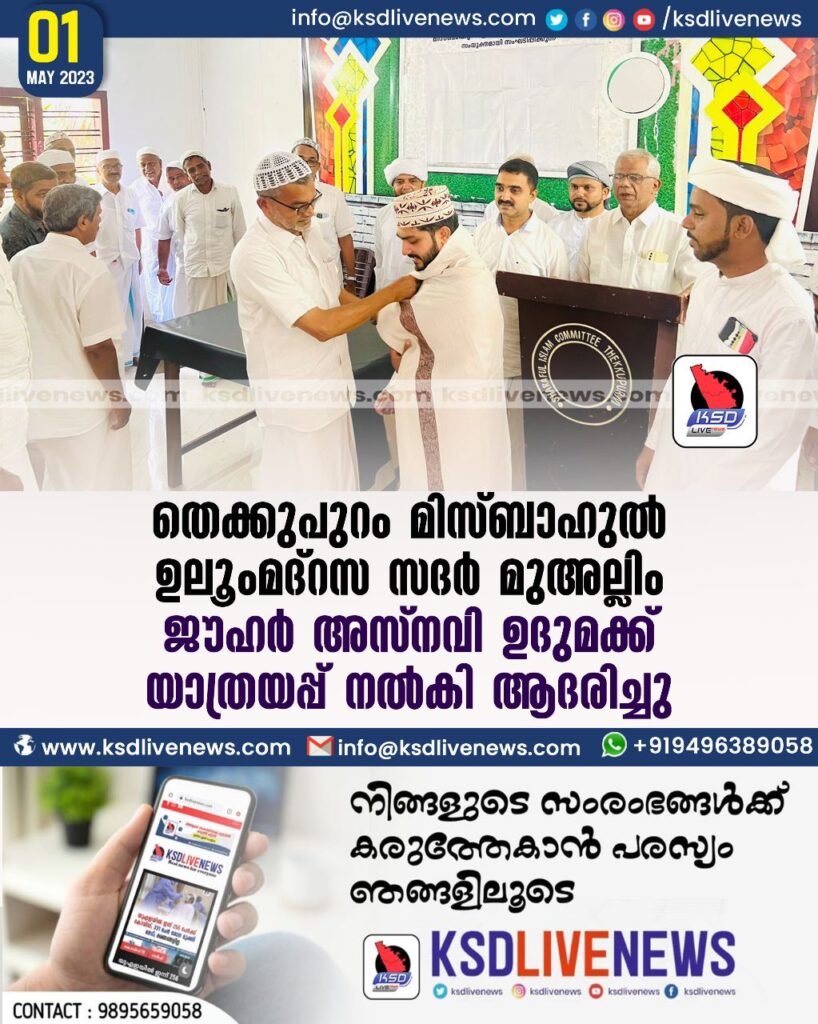 അടിക്കുറിപ്പ് :- തെക്കുപുറം മിസ്ബാഹുൽ ഉലൂം മദ്റസയിൽ 2 വർഷം സദർ മുഅല്ലിം യായി സേവനം ചെയ്ത ജൗഹർ അസ്നവി ഉദുമക്ക് ശറഫുൽ ഇസ്ലാം ജമാഅത്ത് കമ്മിറ്റി യാത്രയപ്പ് നൽകി ആദരിച്ചു.