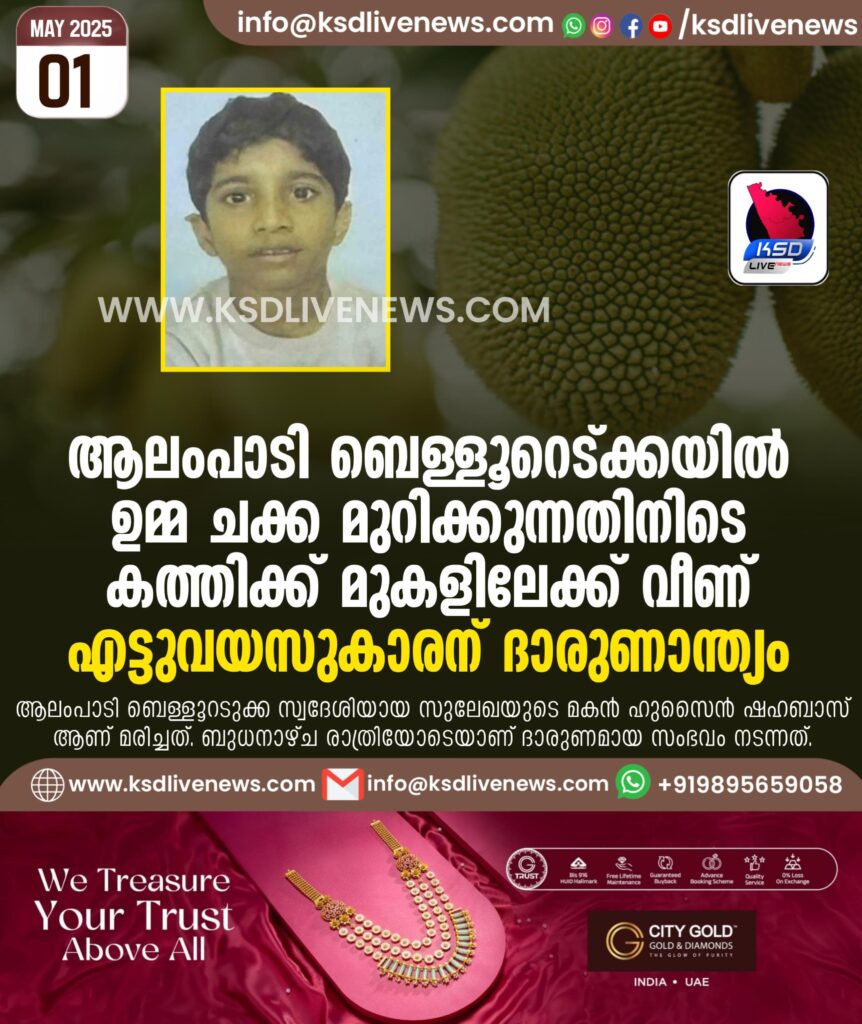 ആലംപാടി ബെള്ളൂറെട്ക്കയിൽ ഉമ്മ ചക്ക മുറിക്കുന്നതിനിടെ കത്തിക്ക് മുകളിലേക്ക് വീണ് എട്ടുവയസുകാരന് ദാരുണാന്ത്യം