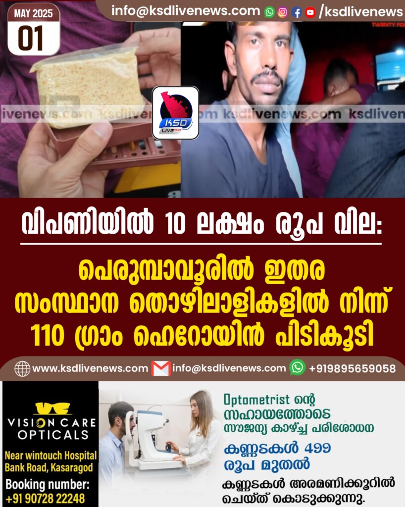 വിപണിയിൽ 10 ലക്ഷം രൂപ വില; പെരുമ്പാവൂരിൽ ഇതര സംസ്ഥാന തൊഴിലാളികളിൽ നിന്ന് 110 ഗ്രാം ഹെറോയിൻ പിടികൂടി