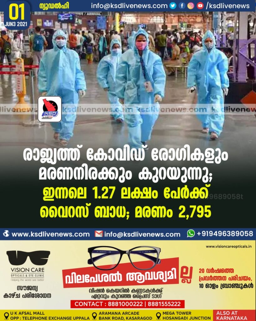 രാജ്യത്ത് കോവിഡ് രോഗികളും മരണനിരക്കും കുറയുന്നു; ഇന്നലെ 1.27 ലക്ഷം പേര്‍ക്ക് വൈറസ് ബാധ; മരണം 2,795