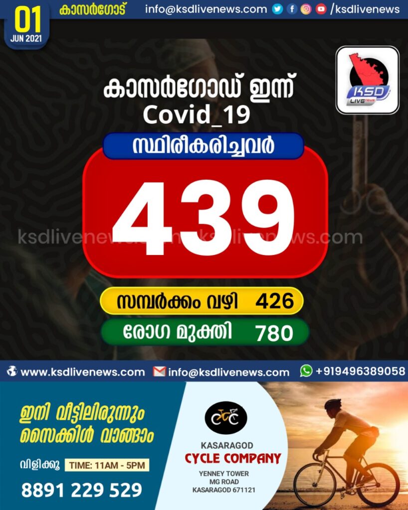 കാസർഗോഡ് ജില്ലയിൽ ഇന്ന് 439 പേർക്ക് കോവിഡ് സ്ഥിരീകരിച്ചു. സമ്പർക്കം വഴി 426 പേർക്കും. 780 പേർക്ക് രോഗമുക്തി