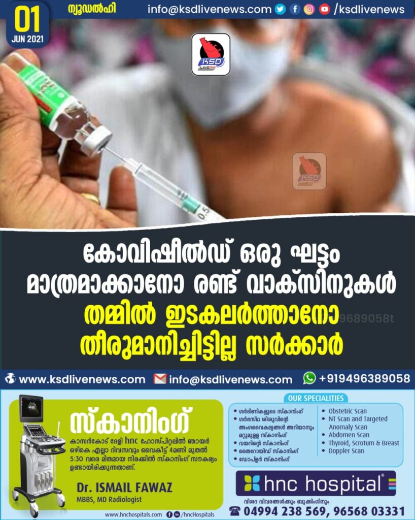 കോവിഷീല്ഡ് ഒരു ഘട്ടം മാത്രമാക്കാനോ രണ്ട് വാക്സിനുകള് തമ്മില് ഇടകലര്ത്താനോ തീരുമാനിച്ചിട്ടില്ല -സര്ക്കാര്