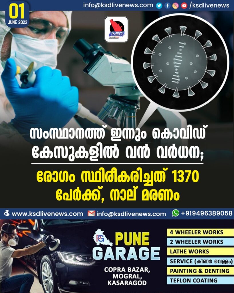 സംസ്ഥാനത്ത് ഇന്നും കൊവിഡ് കേസുകളിൽ വൻ വർധന; രോഗം സ്ഥിരീകരിച്ചത് 1370 പേർക്ക്, നാല് മരണം