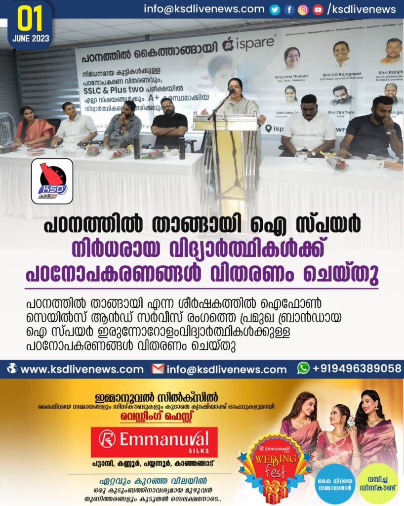 എറണാകുളം: പഠനത്തിൽ താങ്ങായി എന്ന ശീർഷകത്തിൽ ഐഫോൺ സെയിൽസ് ആൻഡ് സർവീസ് രംഗത്തെ പ്രമുഖ ബ്രാൻഡായ ഐ സ്പയർ ഇരുന്നോറോളം വിദ്യാർത്ഥികൾക്കുള്ള പഠനോപകരണങ്ങൾ വിതരണം ചെയ്തു ..കൂടാതെ എറണാകുളം വൈറ്റില ജനത വാർഡിലെ 2022-2023 എസ് എസ് എൽ സി ,പ്ലസ് ടു പരീക്ഷയിൽ എല്ലാ വിഷയത്തിലും എ+ കരസ്ഥമാക്കിയ വിദ്യാർത്ഥികളെ ആദരിക്കുകയും ചെയ്തു ..ഐ സ്പെയർ വൈറ്റില ഷോറൂമിൽ നടന്ന ചടങ്ങ് ബഹുമാനപ്പെട്ട തൃക്കാക്കര എം എൽ എ ശ്രീമതി ഉമാ തോമസ് ഉൽഘാടനം ചെയ്തു .ഐ സ്പെയർ എം ഡി ശ്രീ നിസാം മുസാഫിർ സ്വാഗതം പറഞ്ഞു . ബിജെപി സംസ്ഥാന കമ്മിറ്റി മെമ്പർ ശ്രീ സിജി രാജഗോപാൽ ,വൈറ്റില ജനത കൗൺസിലർ ശ്രീമതി സോണി ജോസഫ് ,ജി എസ് ടി അസിസ്റ്റൻഡ് കമ്മീഷണർ ശ്രീ ഷാജഹാൻ ,ചലച്ചിത്ര താരങ്ങളായ ശ്രീ ടിനി ടോം , ശ്രീ അരുൺഗോപി ,ഐ സ്പെയർ പാർട്ണർ മാരായ ശ്രീ വെങ്കിട്ട് സുനിൽ ,ശ്രീ സൂരജ് എസ് കെ ,ശ്രീ അസർ ,ശ്രീ അഡ്വ അനസ് ,ശ്രീ നസീർ എന്നിവർ പങ്കെടുത്തു സംസാരിച്ചു .മരട് സർക്കിൾ ഇൻസ്പെക്ടർ ശ്രീ സാജു ജോർജ് ,യുവജനക്ഷേമ ബോർഡ് ജില്ലാ കോഡിനേറ്റർ ശ്രീ രഞ്ജിത്ത് ആശംസകൾ അറിയിച്ചു.ശ്രീ ആഷിഖ് ഇബ്രാഹിം നന്ദിയും പറഞ്ഞു .