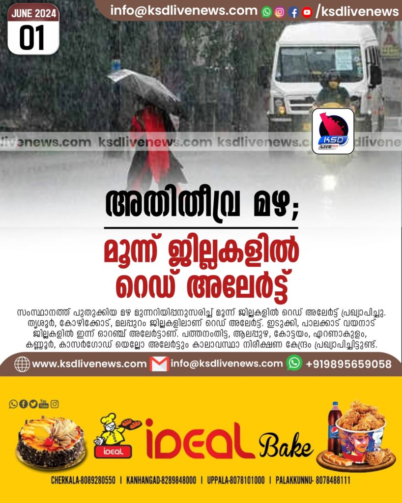 സംസ്ഥാനത്ത് പുതുക്കിയ മഴ മുന്നറിയിപ്പനുസരിച്ച് മൂന്ന് ജില്ലകളില്‍ റെഡ് അലേര്‍ട്ട് പ്രഖ്യാപിച്ചു. തൃശൂര്‍, കോഴിക്കോട്, മലപ്പുറം ജില്ലകളിലാണ് റെഡ് അലേര്‍ട്ട്. ജില്ലകളില്‍ ഇന്ന് അതിതീവ്ര മഴയ്ക്ക് സാധ്യതയുണ്ടെന്ന് കാലാവസ്ഥാ നിരീക്ഷണ കേന്ദ്രം അറിയിച്ചു. നിലവില്‍ കോഴിക്കോടിന്റെ കിഴക്കന്‍ മലയോരത്ത് ശക്തമായ മഴയുണ്ട്. മുക്കം മേഖലയിലാണ് ഇടിയോടുകൂടി മഴ പെയ്യുന്നത്.