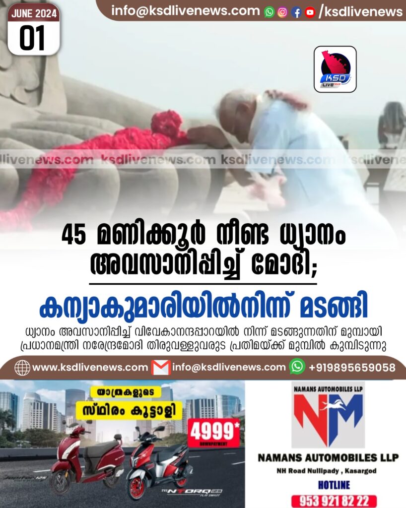 45 മണിക്കൂര് നീണ്ട ധ്യാനം അവസാനിപ്പിച്ച് മോദി; കന്യാകുമാരിയില്നിന്ന് മടങ്ങി