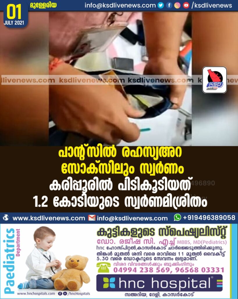 പാന്റ്സില് രഹസ്യഅറ, സോക്സിലും സ്വര്ണം ! കരിപ്പൂരില് പിടികൂടിയത് 1.2 കോടിയുടെ സ്വര്ണമിശ്രിതം