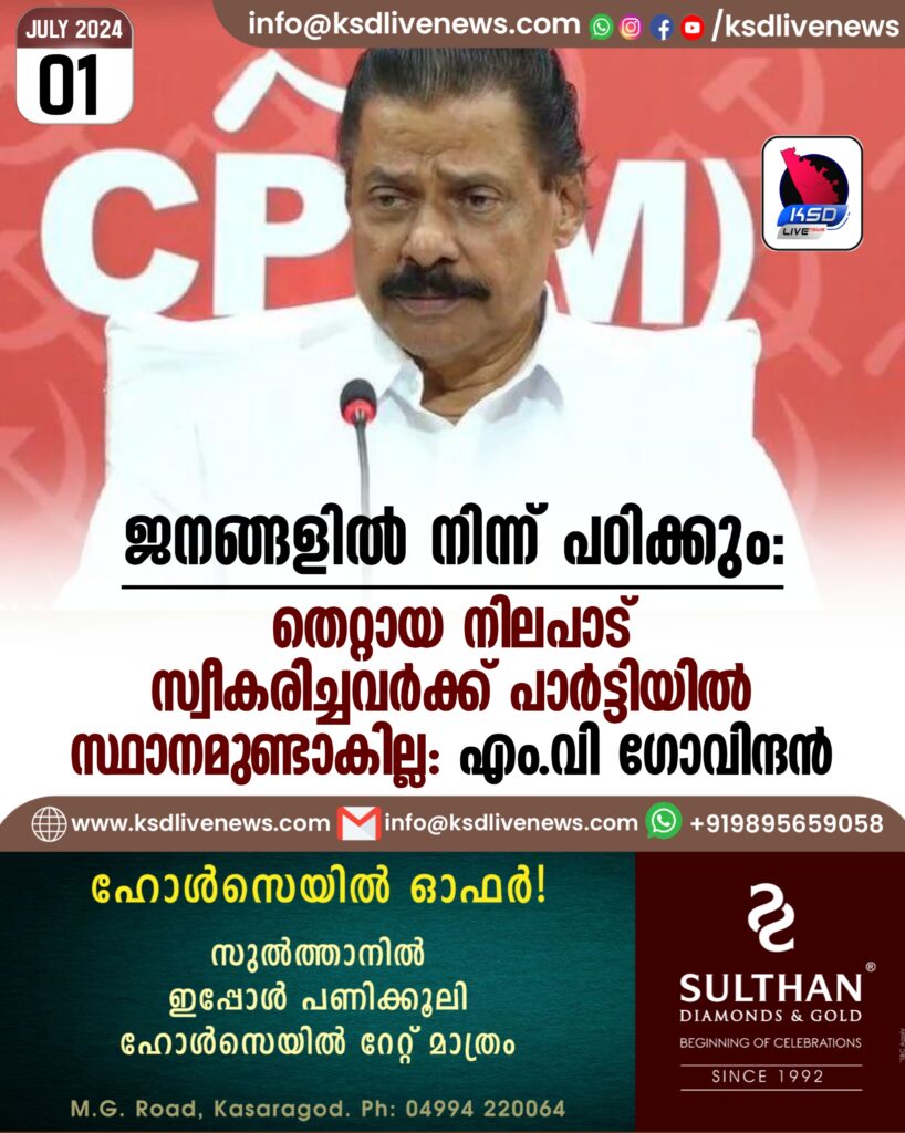 ജനങ്ങളിൽനിന്ന് പഠിക്കും,തെറ്റായ നിലപാട് സ്വീകരിച്ചവർക്ക് പാര്ട്ടിയിൽ സ്ഥാനമുണ്ടാകില്ല- MV ഗോവിന്ദൻ
