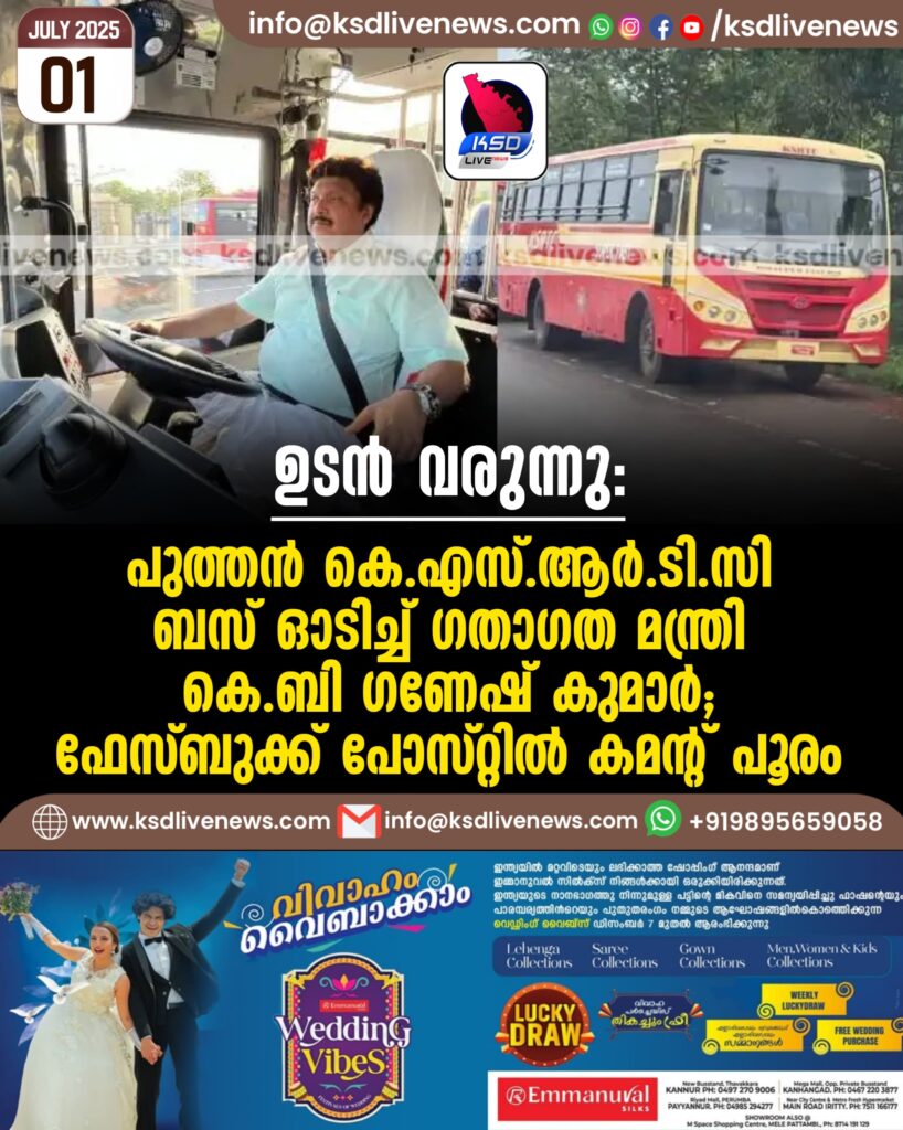 ഉടൻ വരുന്നു! പുത്തൻ കെഎസ്ആര്ടിസി ബസ് ഓടിച്ച് ഗതാഗത മന്ത്രി കെബി ഗണേഷ്കുമാര്, ഫേസ്ബുക്ക് പോസ്റ്റില് കമന്റ് പൂരം