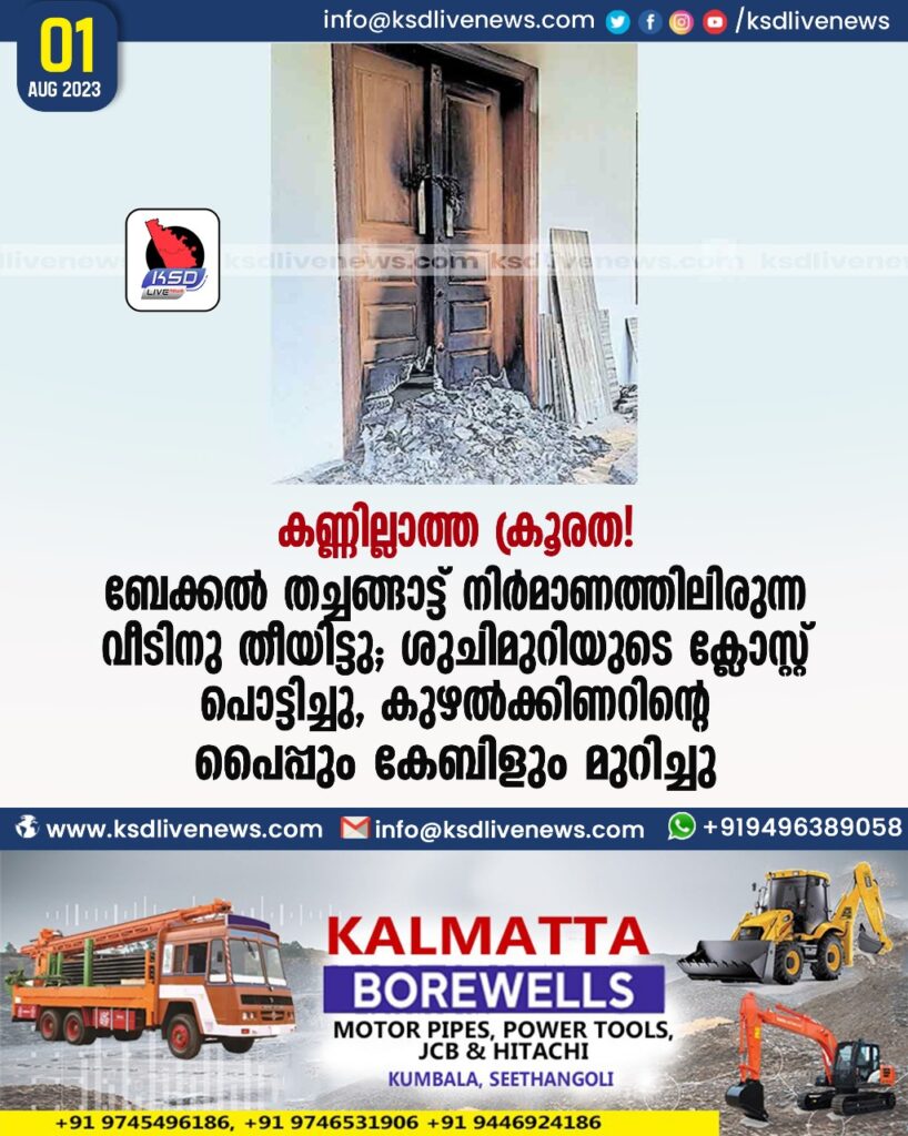 കണ്ണില്ലാത്ത ക്രൂരത! നിർമാണത്തിലിരുന്ന വീടിനു തീയിട്ടു; ശുചിമുറിയുടെ ക്ലോസ്റ്റ് പൊട്ടിച്ചു, കുഴൽക്കിണറിന്റെ പൈപ്പും കേബിളും മുറിച്ചു