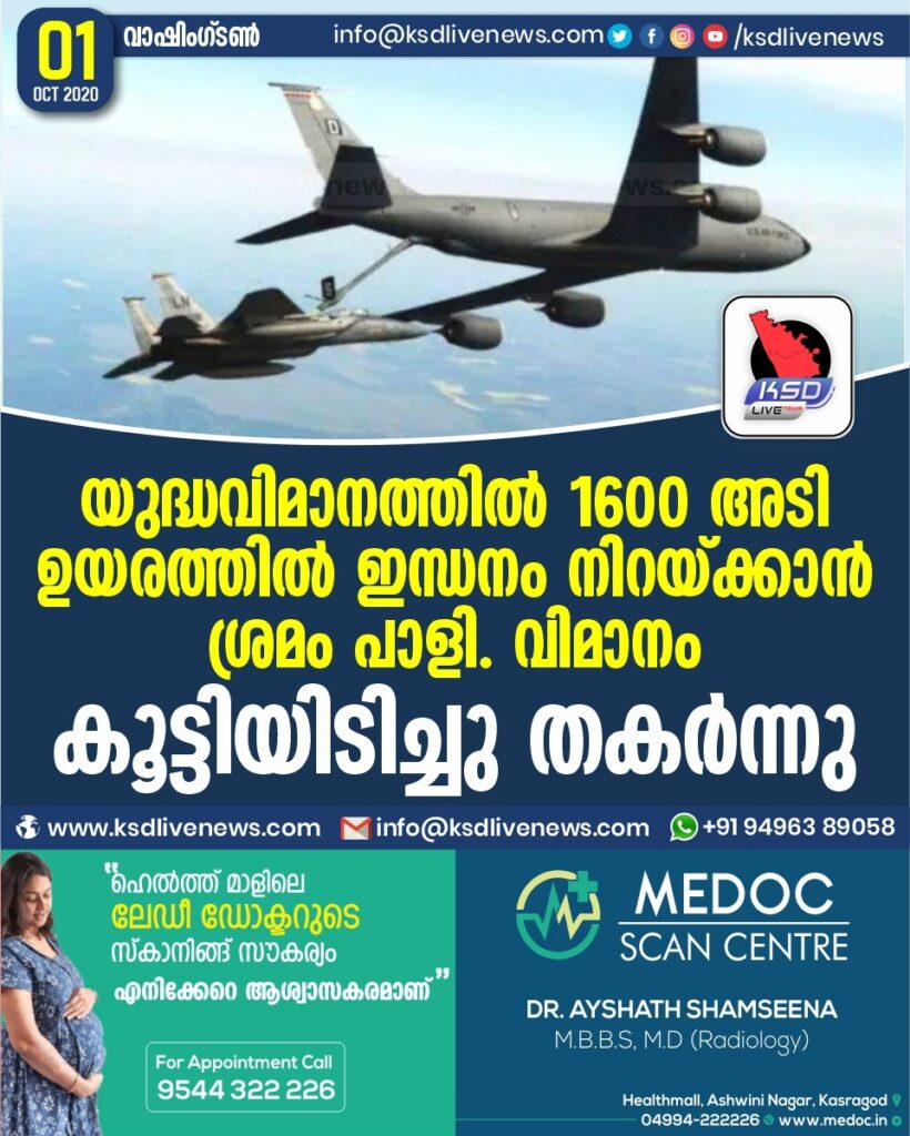 യുദ്ധവിമാനത്തിൽ 1600 അടി ഉയരത്തിൽ ഇന്ധനം നിറയ്ക്കാൻ ശ്രമം പാളി. വിമാനം കൂട്ടിയിടിച്ചു തകർന്നു
