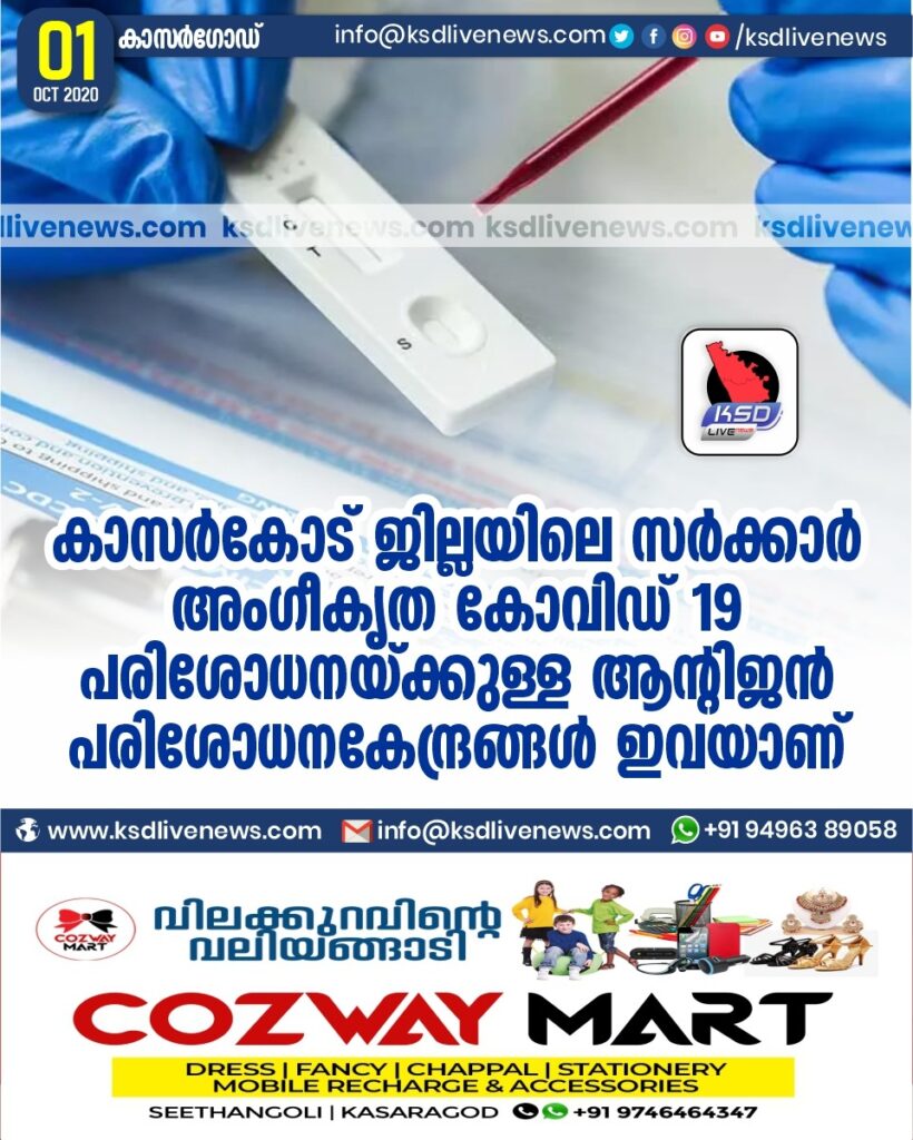 കാസർകോട് ജില്ലയിലെ സർക്കാർ അംഗീകൃത കോവിഡ് 19 , പരിശോധനയ്ക്കുള്ള ആന്റിജൻ പരിശോധനകേന്ദ്രങ്ങൾ ഇവയാണ്