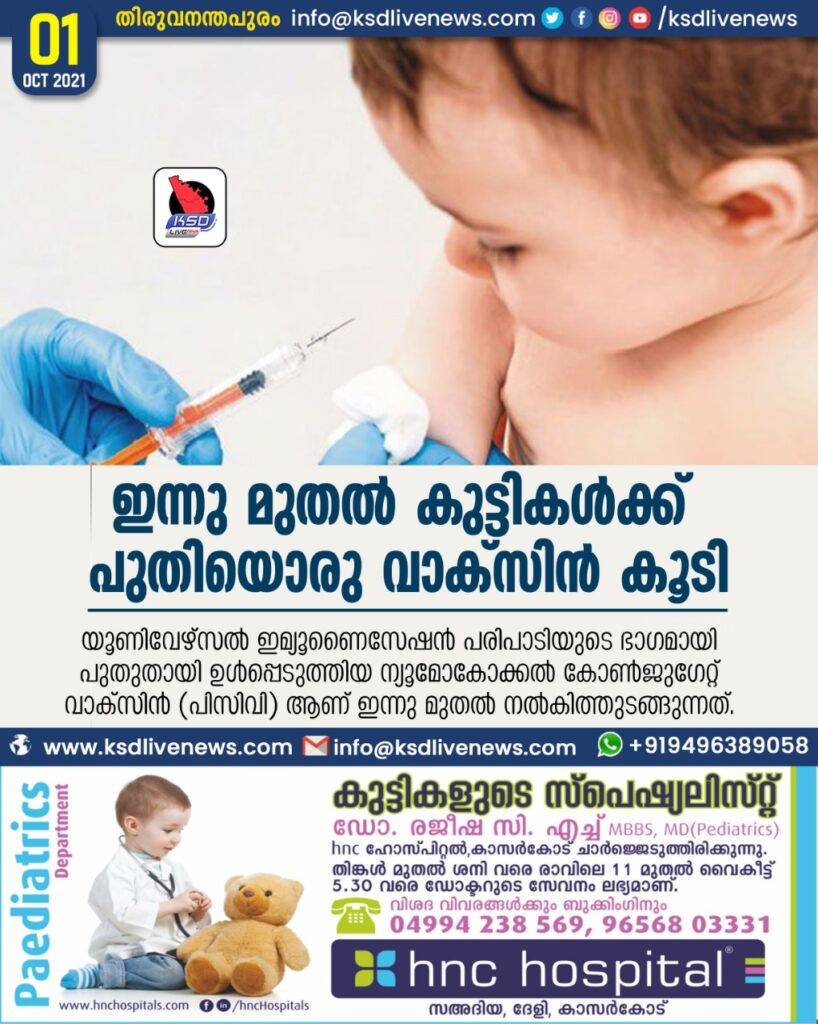 തിരുവനന്തപുരം: സംസ്ഥാനത്ത് ഇന്നുമുതല് കുട്ടികള്ക്കായി പുതിയൊരു വാക്സിനേഷന്കൂടി നല്കും. യൂണിവേഴ്സല് ഇമ്യൂണൈസേഷന് പരിപാടിയുടെ ഭാഗമായി പുതുതായി ഉള്പ്പെടുത്തിയ ന്യൂമോകോക്കല് കോണ്ജുഗേറ്റ് വാക്സിന് (പിസിവി) ആണ് ഇന്നു മുതല് നല്കിത്തുടങ്ങുന്നത്.