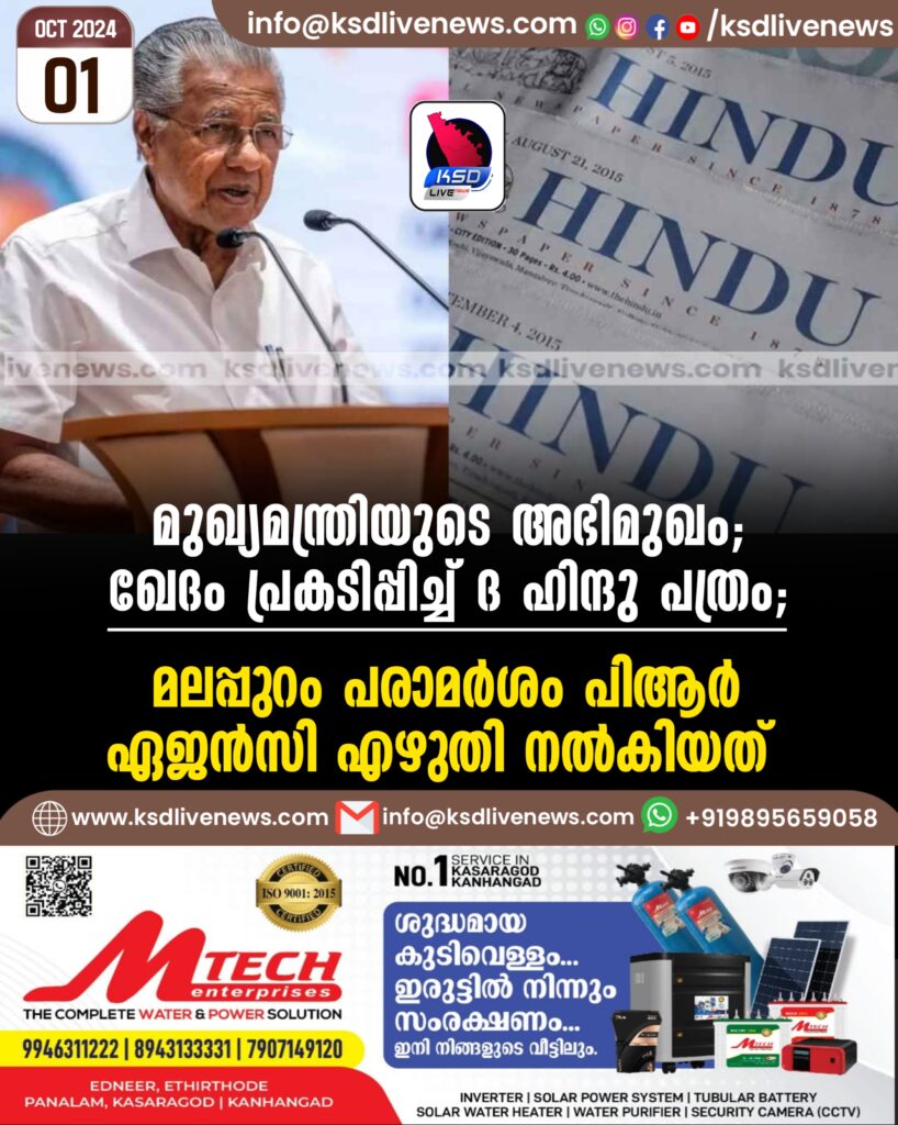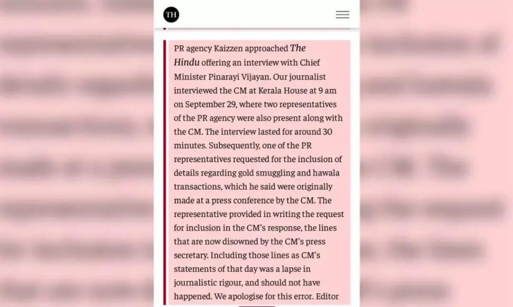 മുഖ്യമന്ത്രിയുടെ അഭിമുഖം: ഖേദം പ്രകടിപ്പിച്ച് ‘ദ ഹിന്ദു’ പത്രം; ‘മലപ്പുറം പരാമര്ശം പിആര് ഏജൻസി എഴുതി നല്കിയത്’