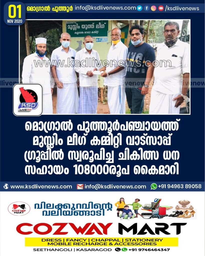 മൊഗ്രാൽ പുത്തൂർപഞ്ചായത്ത് മുസ്ലിം ലീഗ് കമ്മിറ്റി വാട്സാപ്പ് ഗ്രൂപ്പിൽ സ്വരൂപിച്ച ചികിത്സ ധന സഹായം 108000രൂപ കൈമാറി