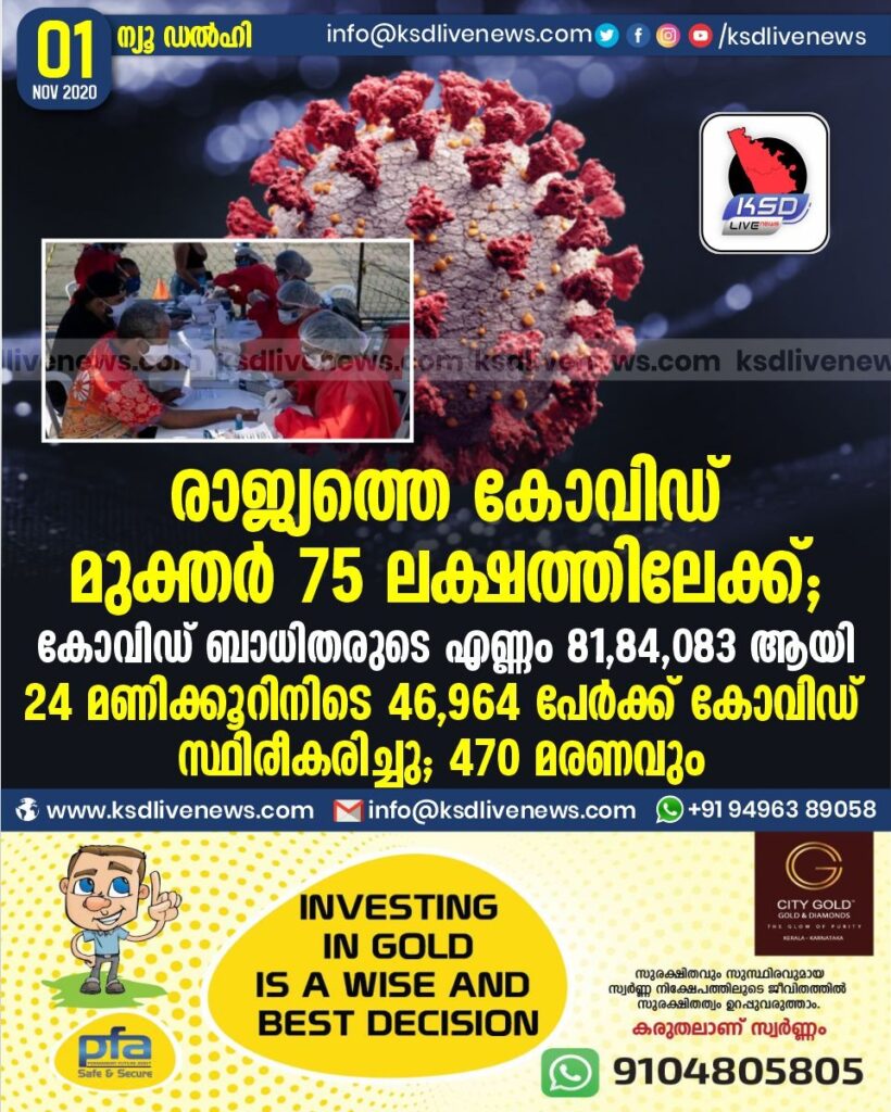 രാജ്യത്തെ കോവിഡ് മുക്തർ 75 ലക്ഷത്തിലേക്ക് ; കോവിഡ് ബാധിതരുടെ എണ്ണം 81,84,083 ആയി ;