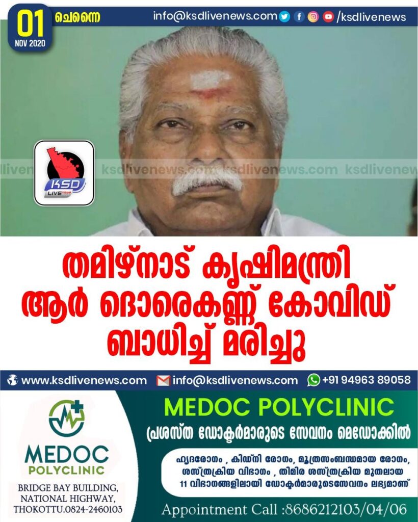 തമിഴ്നാട് കൃഷിമന്ത്രി ആർ ദൊരെകണ്ണ് കോവിഡ് ബാധിച്ച് മരിച്ചു