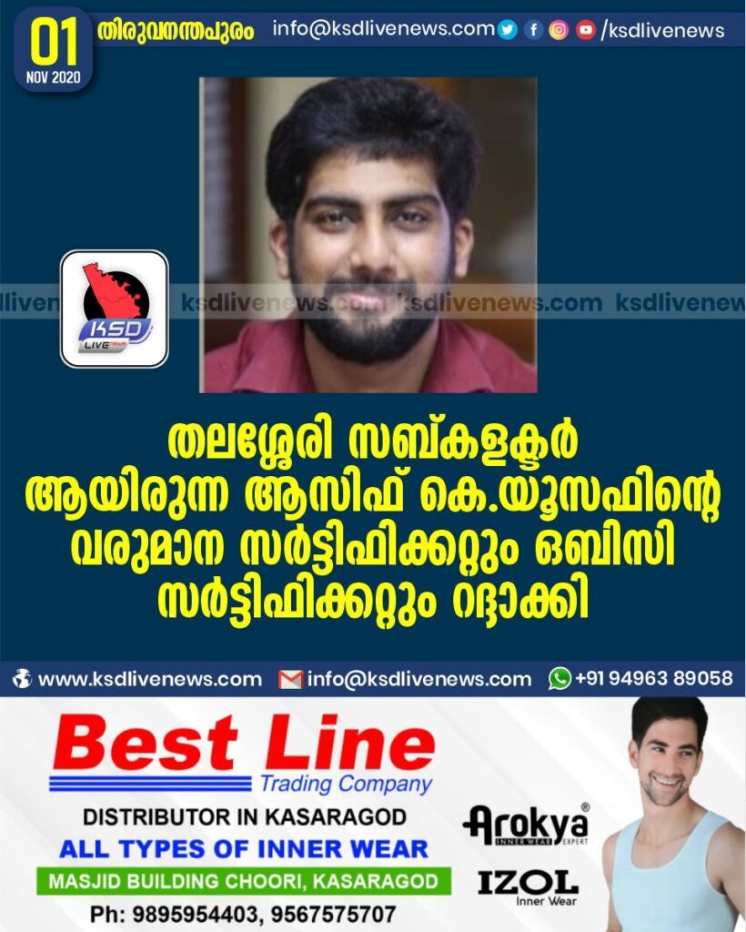തലശ്ശേരി സബ്കളക്ടർ ആയിരുന്ന ആസിഫ് കെ.യൂസഫിന്റെ വരുമാന സര്ട്ടിഫിക്കറ്റും ഒബിസി സര്ട്ടിഫിക്കറ്റും റദ്ദാക്കി