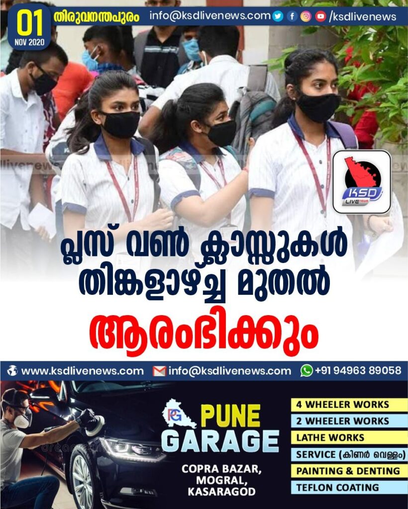 പ്ലസ് വൺ ക്ലാസ്സുകൾ തിങ്കളാഴ്ച്ച മുതൽ ആരംഭിക്കും
